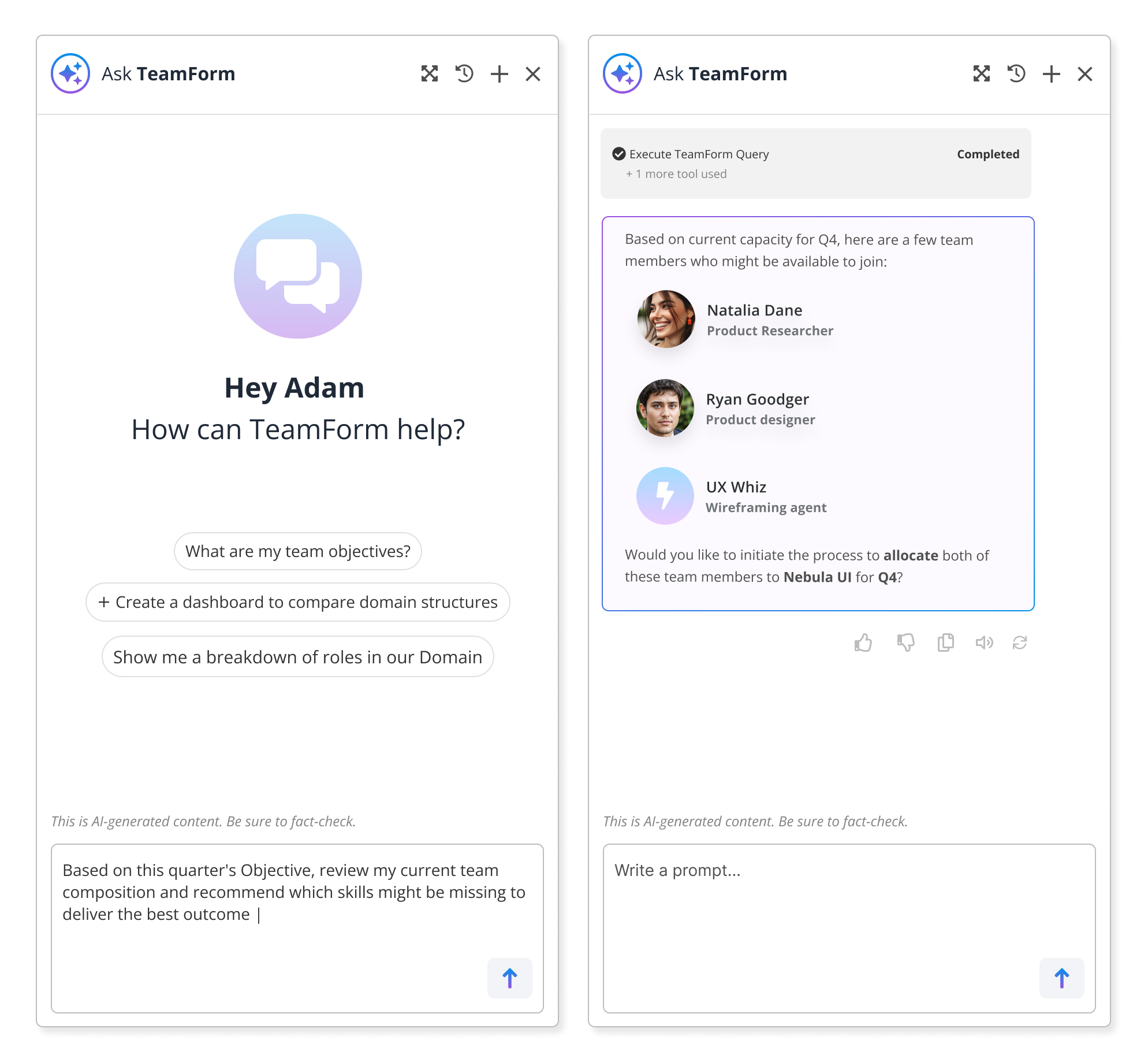 TeamForm’s generative dashboards work directly with your workforce data inside TeamForm. The data understand your organisational structure, role definitions, skills taxonomy, supply and demand models, and workforce language. Insights are contextual, not generic.