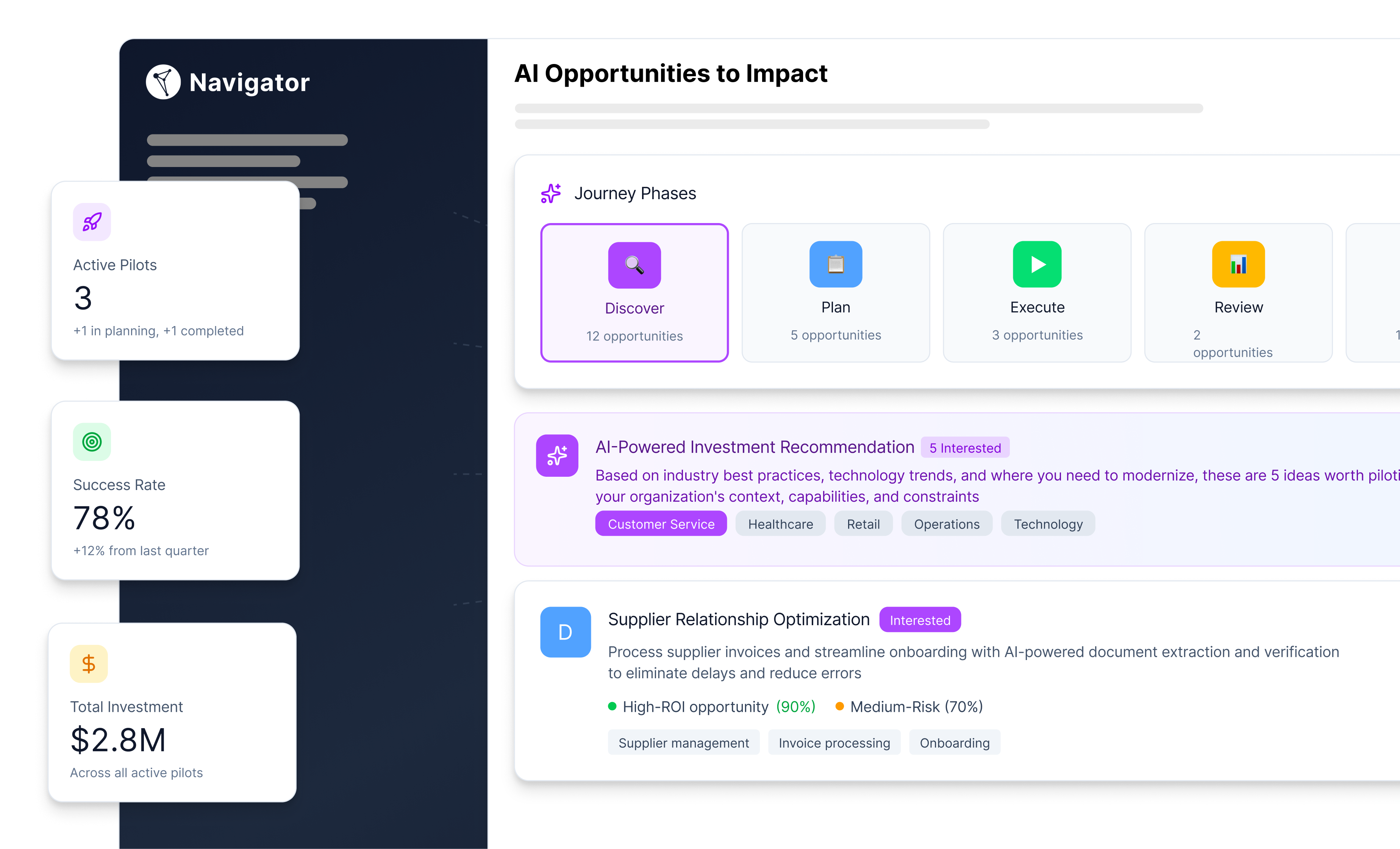 Track each AI initiative from concept to production and realised outcomes. Use evidence to focus on the highest-impact opportunities and retire what doesn’t.