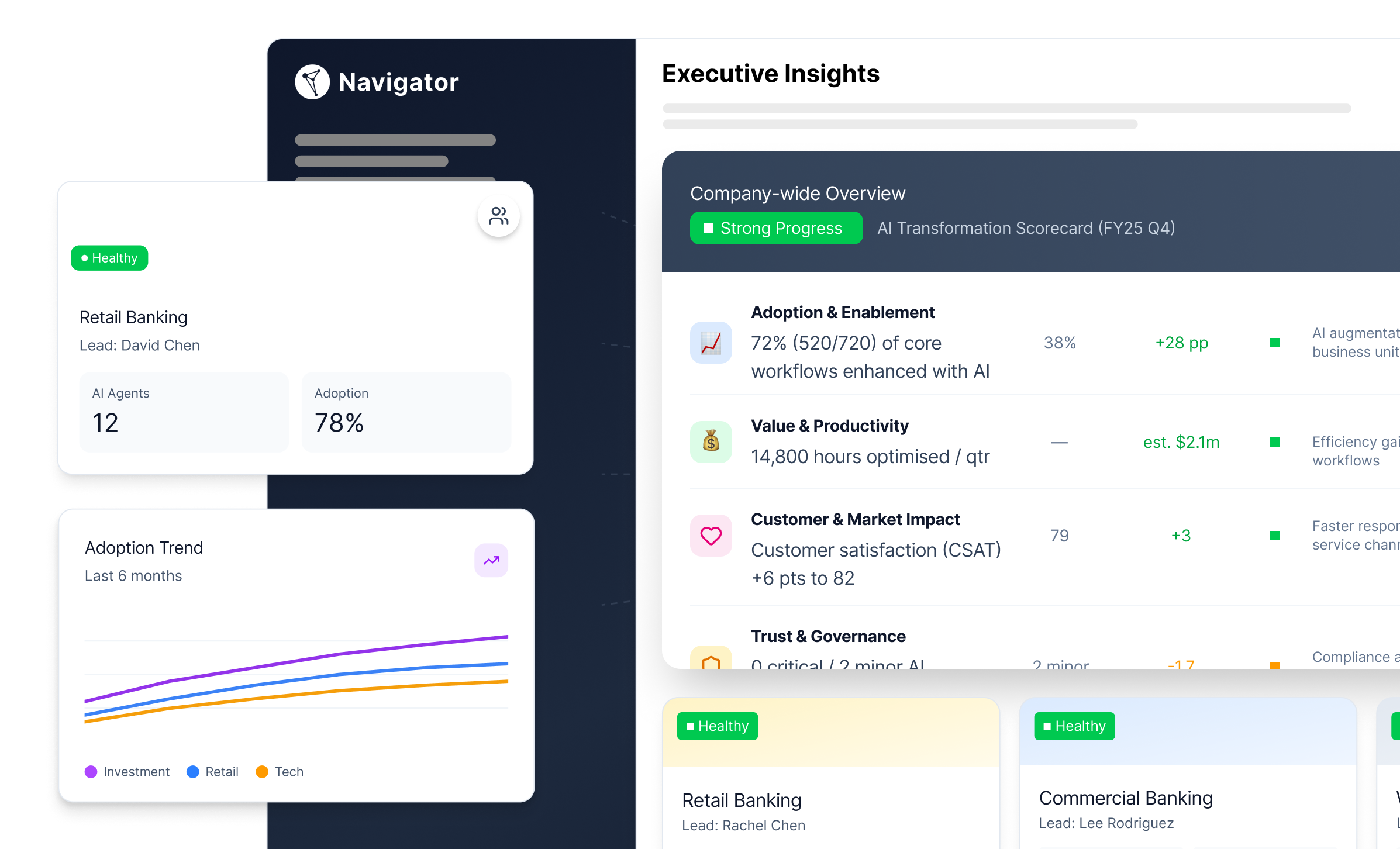 Connect leadership priorities, teams, and AI initiatives under one operating rhythm.